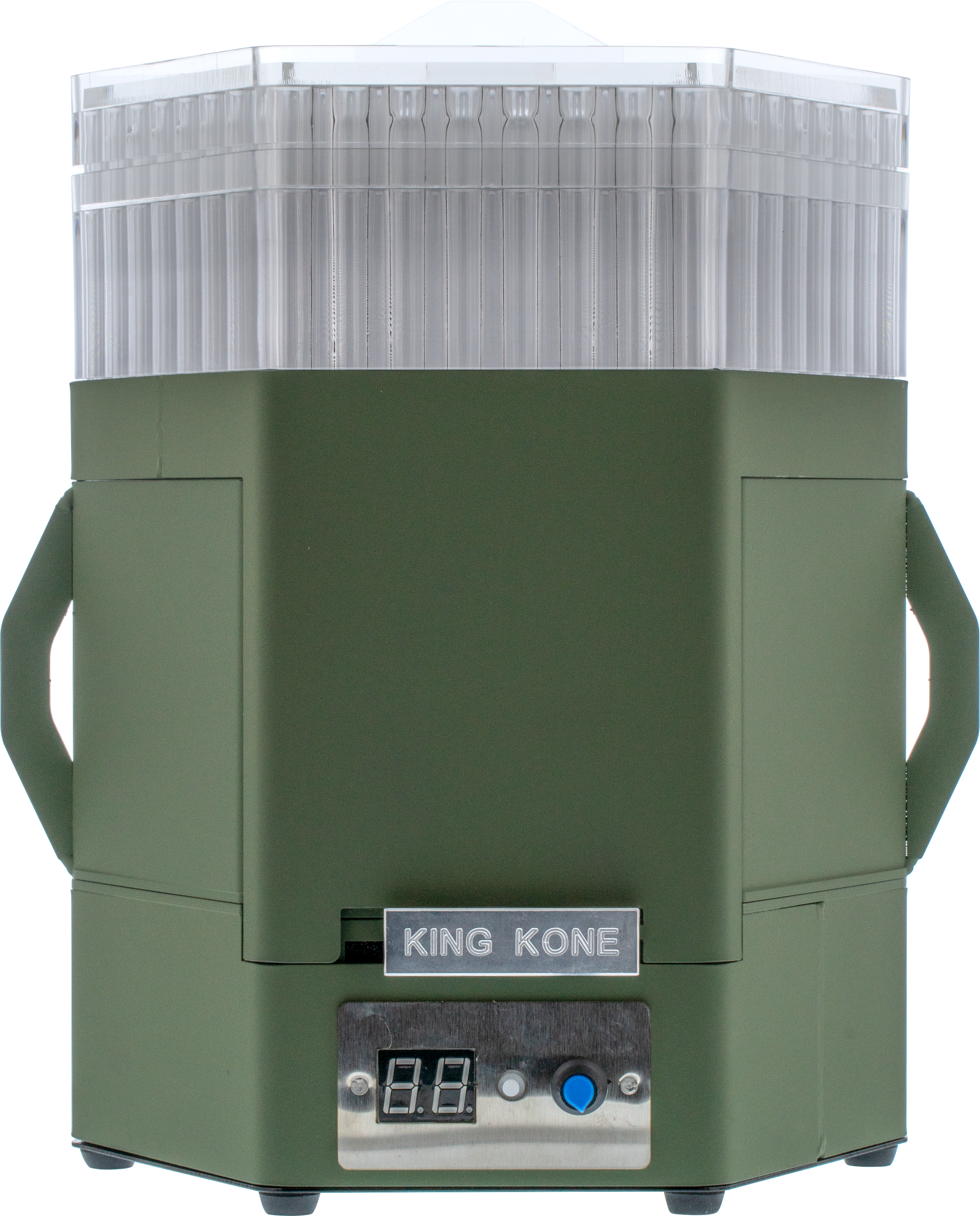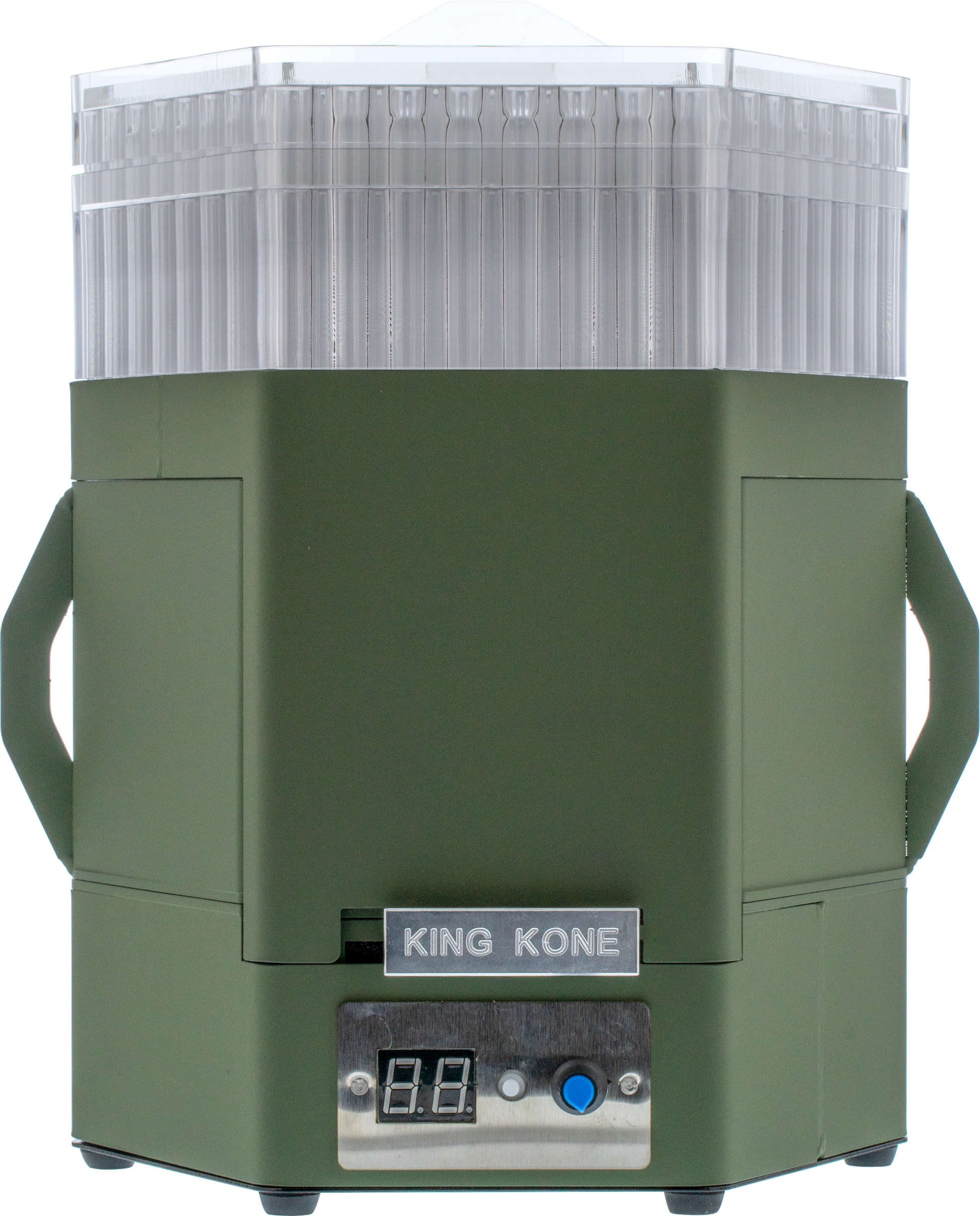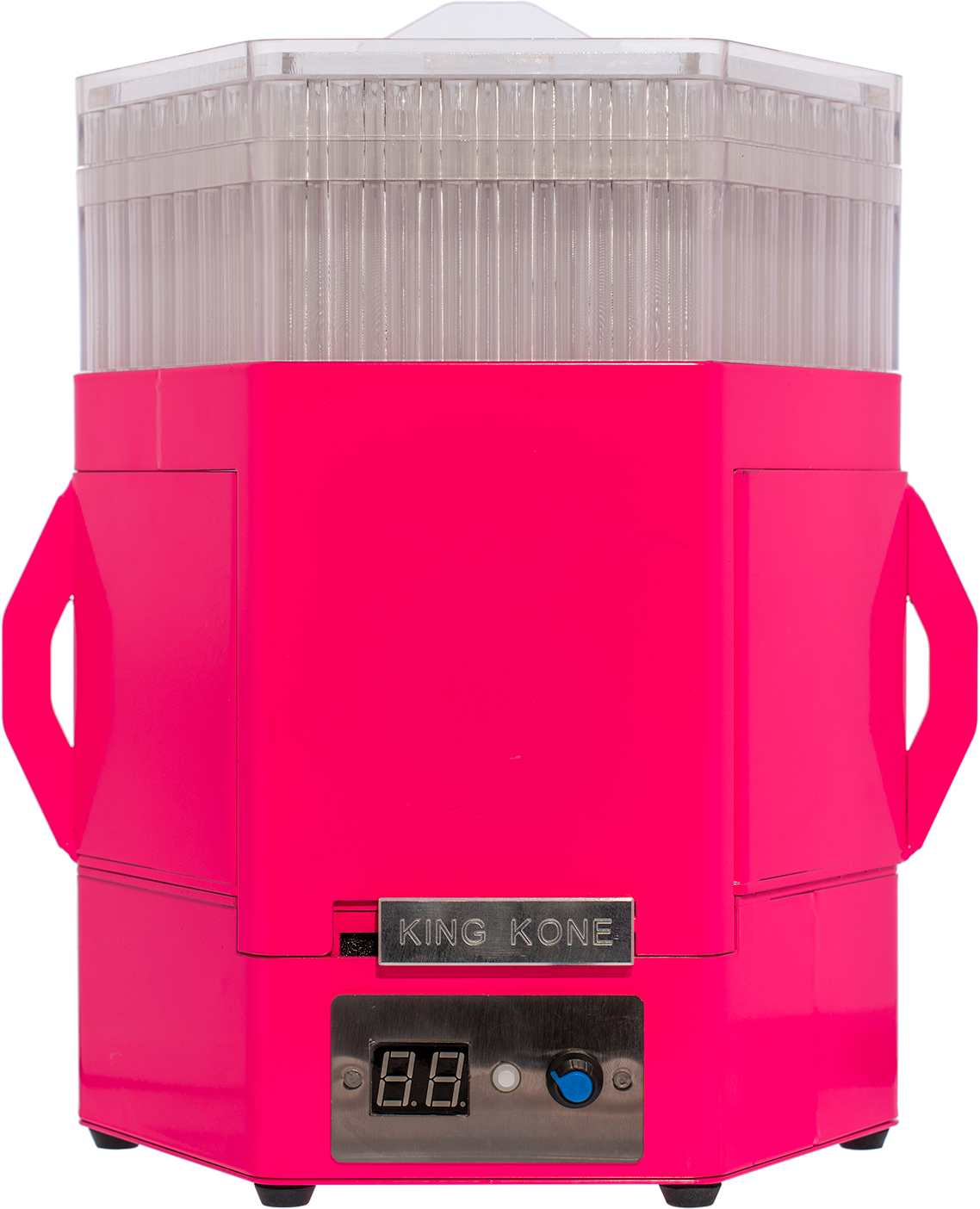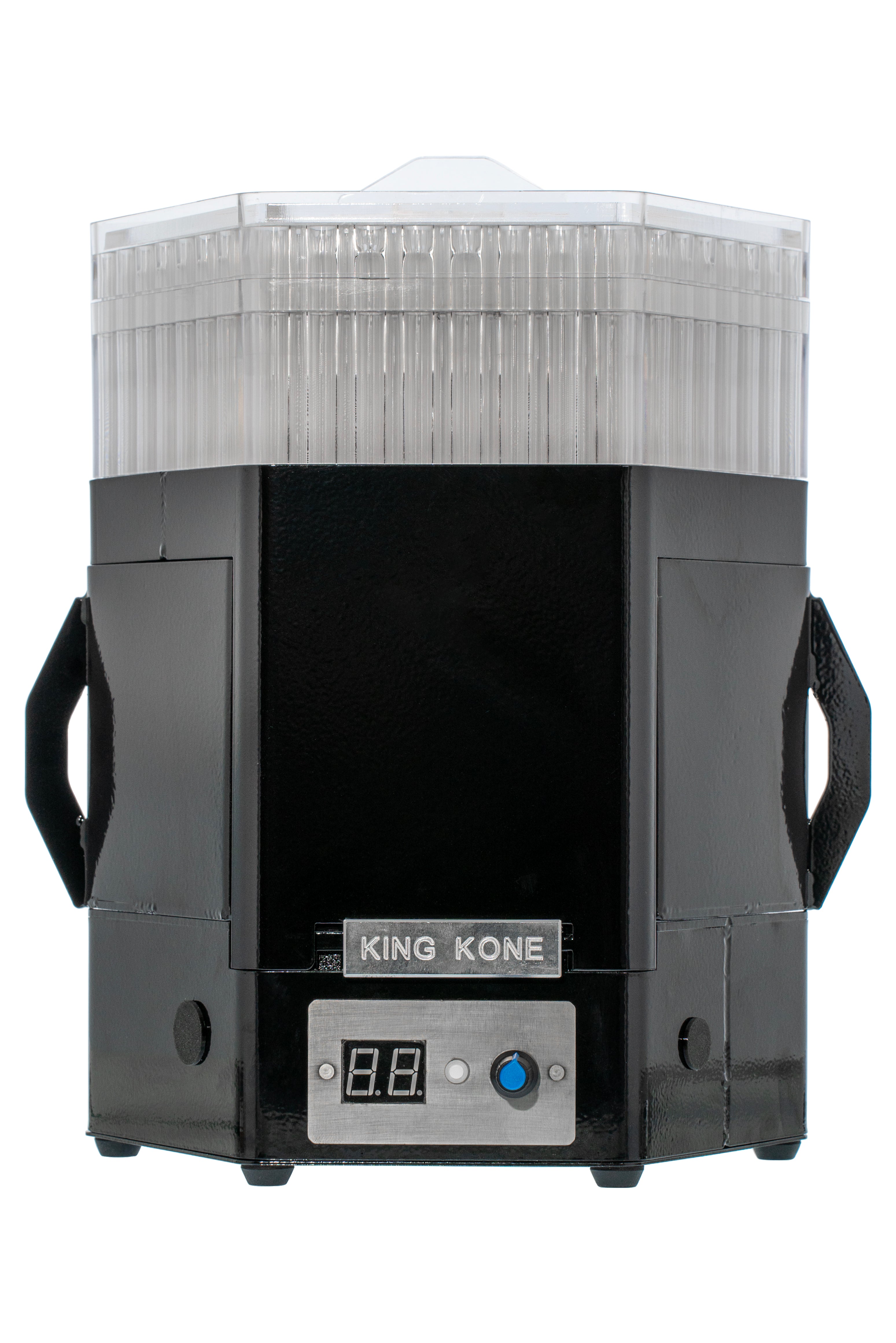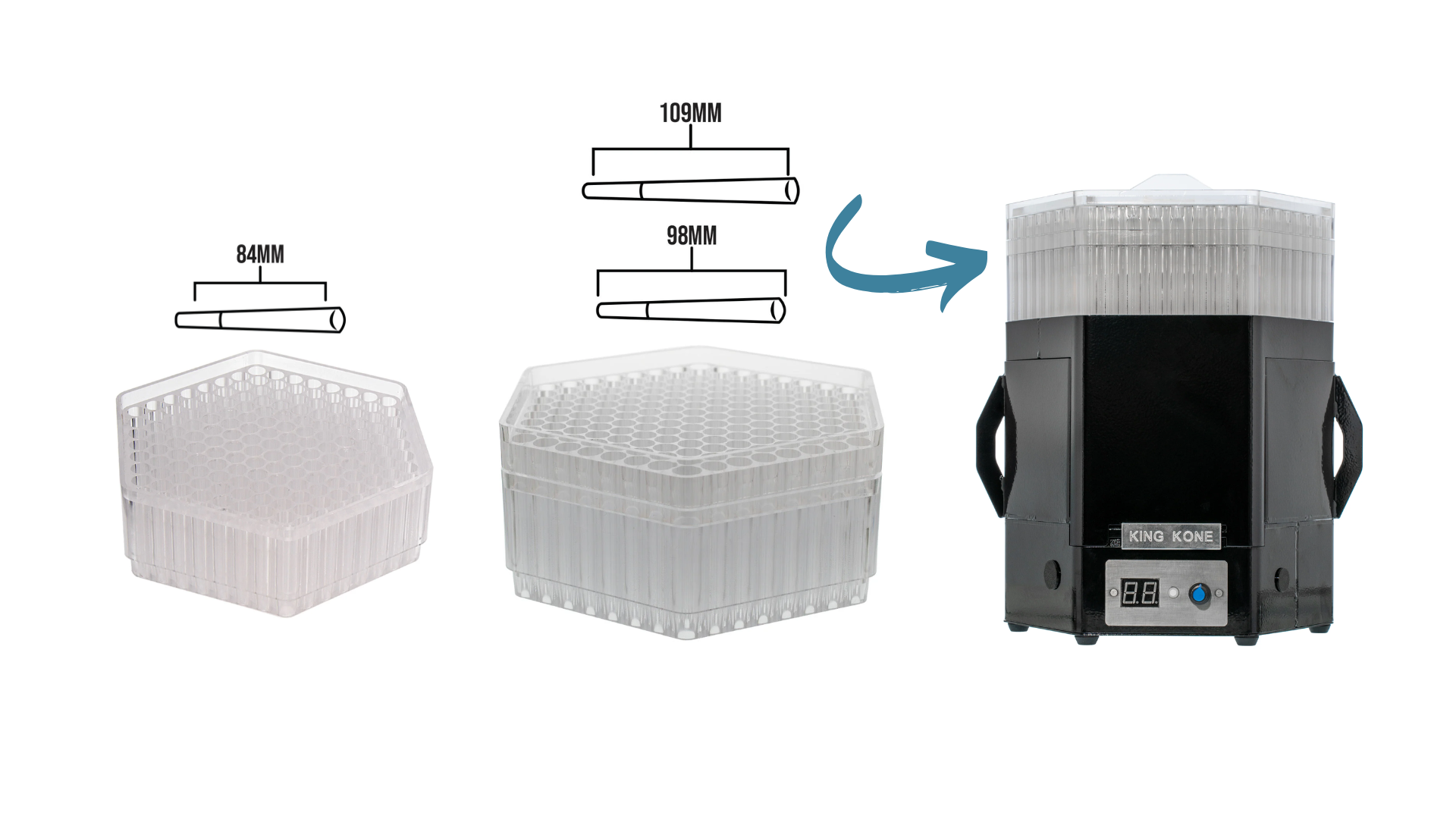 The King Kone holds up to 169 cones at once using its standard clear trays—fitting 84mm, 98mm, and 109mm cones out of the box.