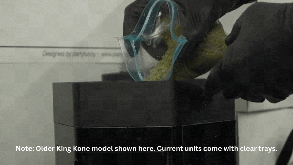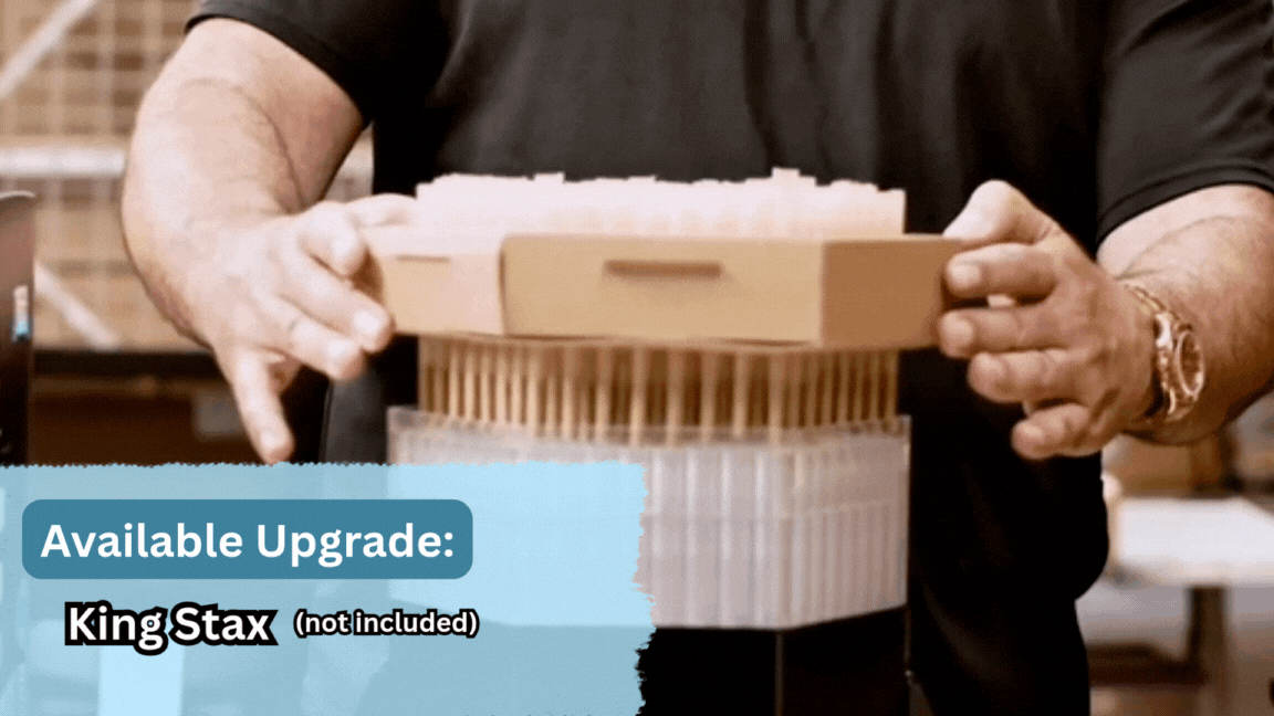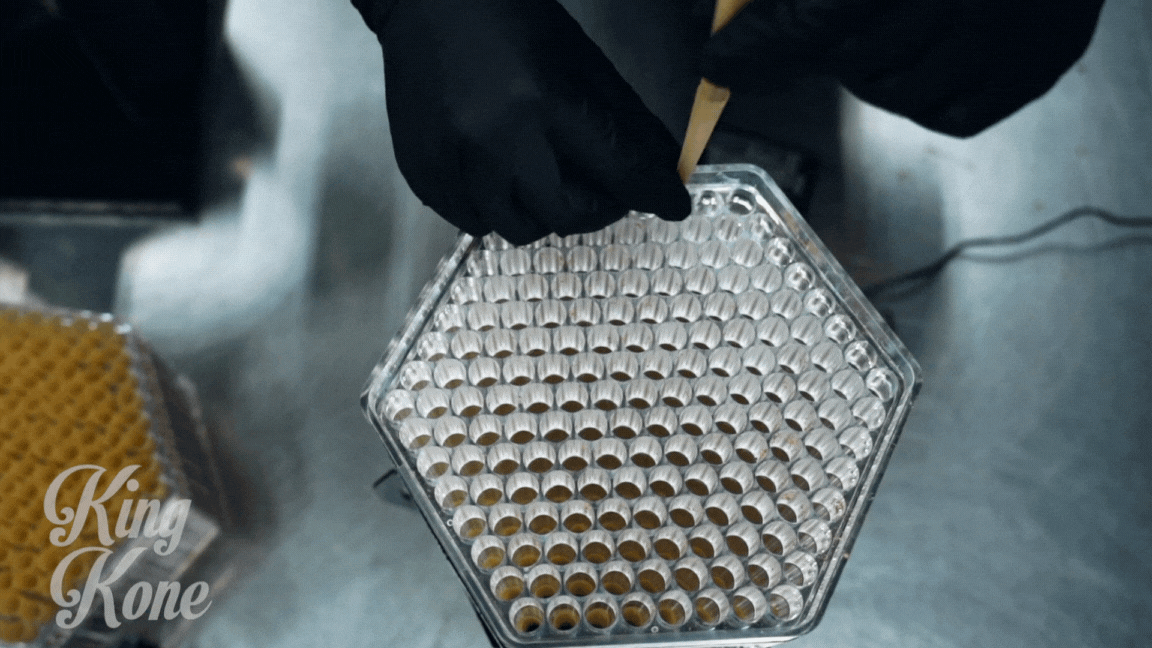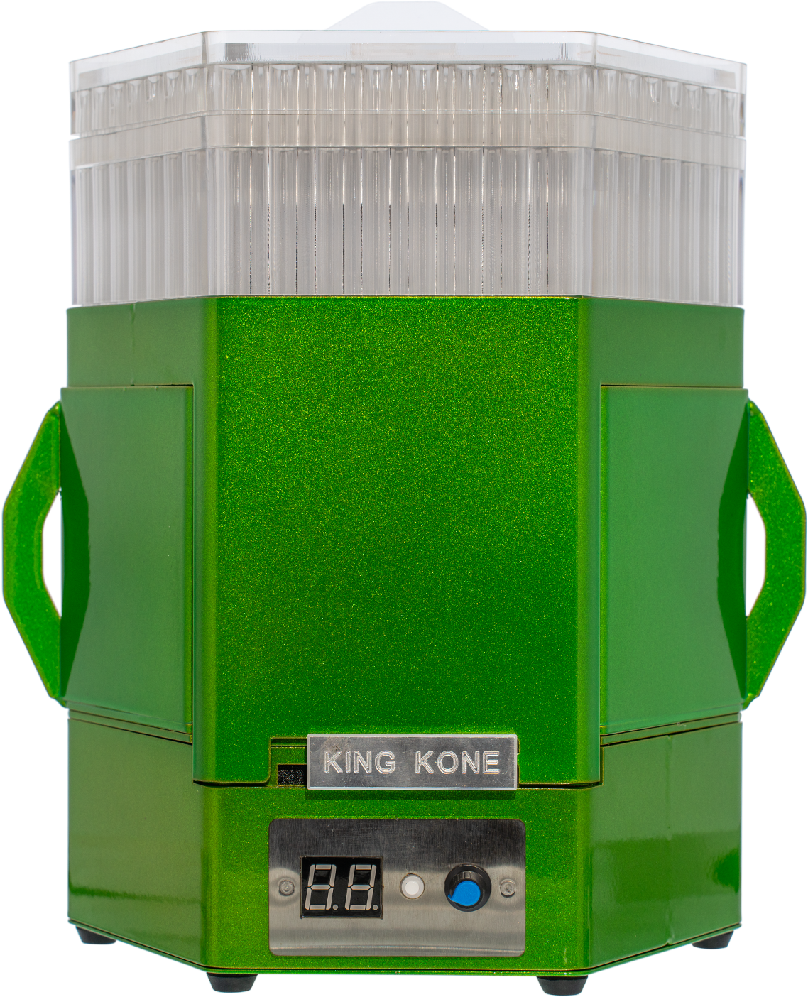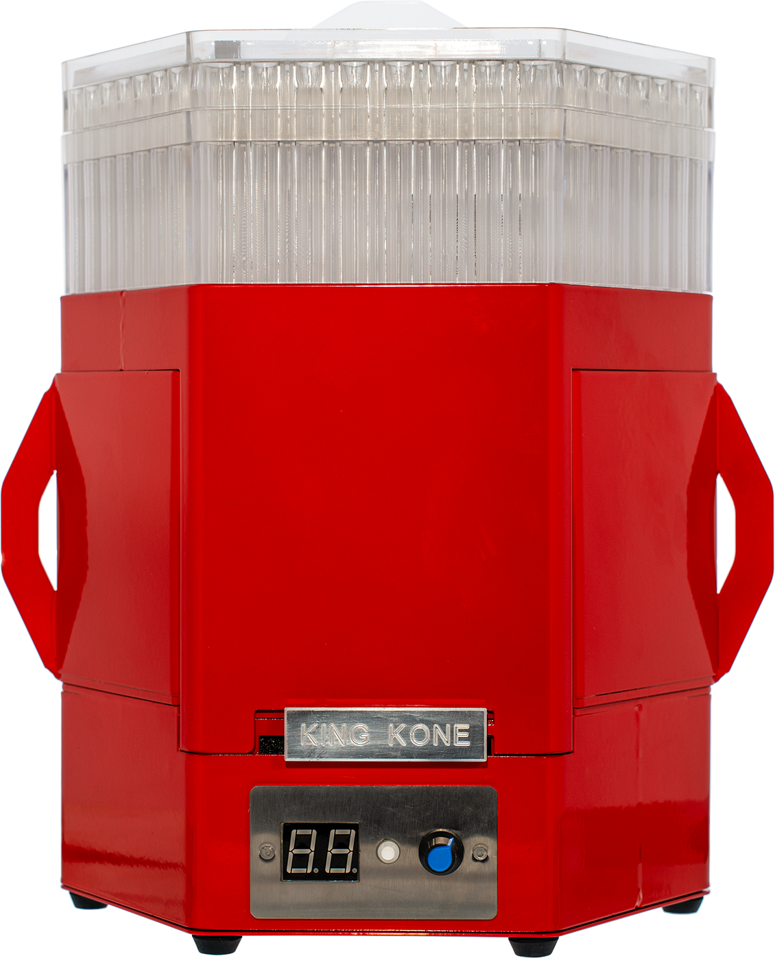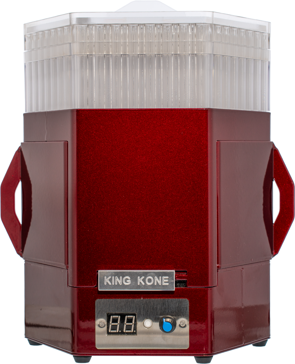 The King Kone holds up to 169 cones at once using its standard clear trays—fitting 84mm, 98mm, and 109mm cones out of the box.